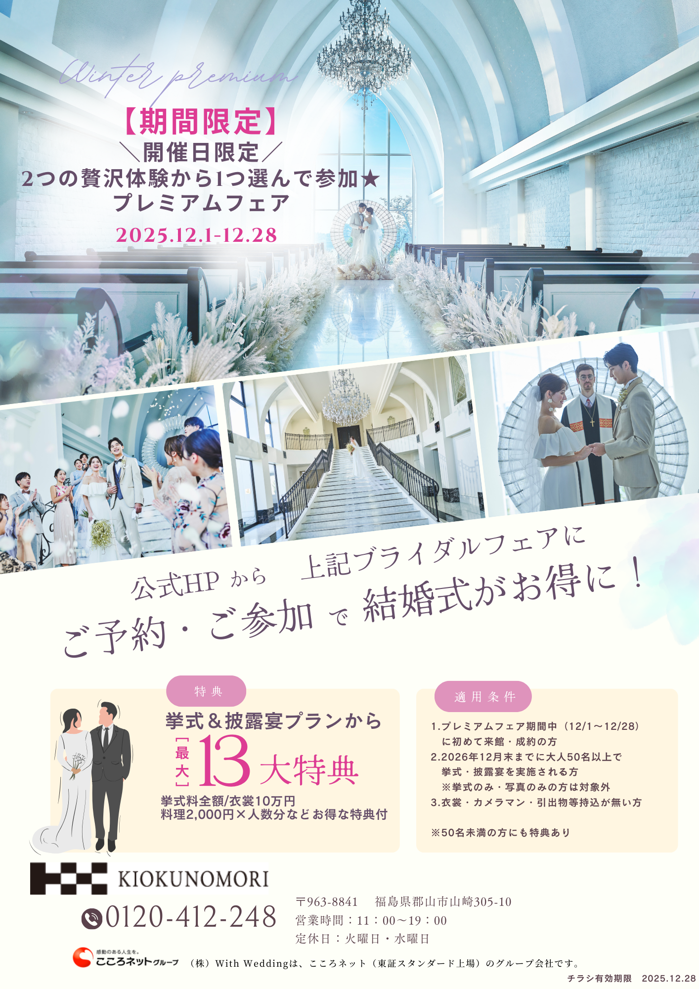 【12月の1カ月限定プレミアムフェア】 豪華13大特典付で通常よりかなりお得 2つの選べる体験型フェア開催!