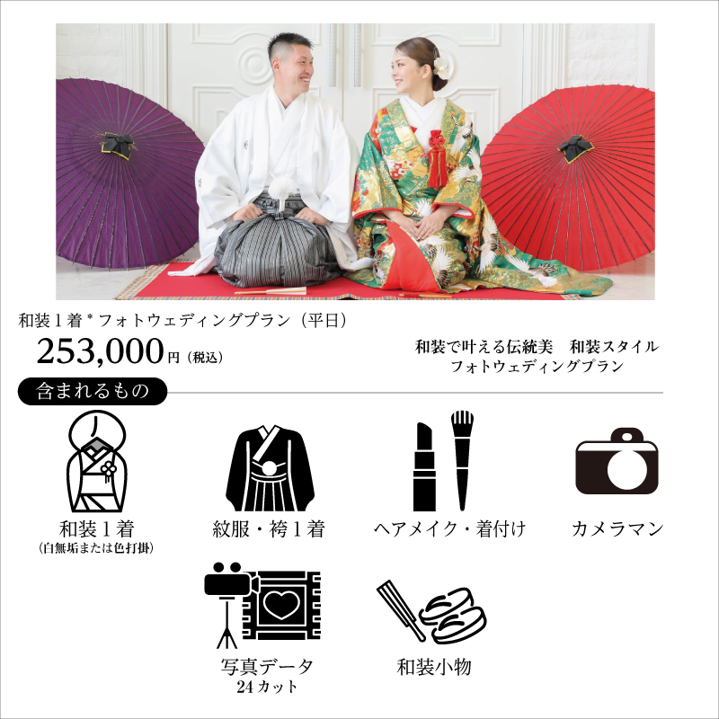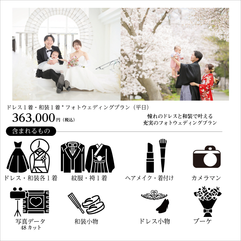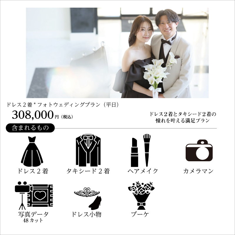 【適用条件】 ■2026年6月末日までにフォトウェディングを実施される方。 ■土・日・祝日をご希望の場合は、追加料金を頂戴いたします。また、受付は2ヶ月前からとなります。 ※プラン内容は、フォトウェディング専門店Licca.郡山と共通プランです。